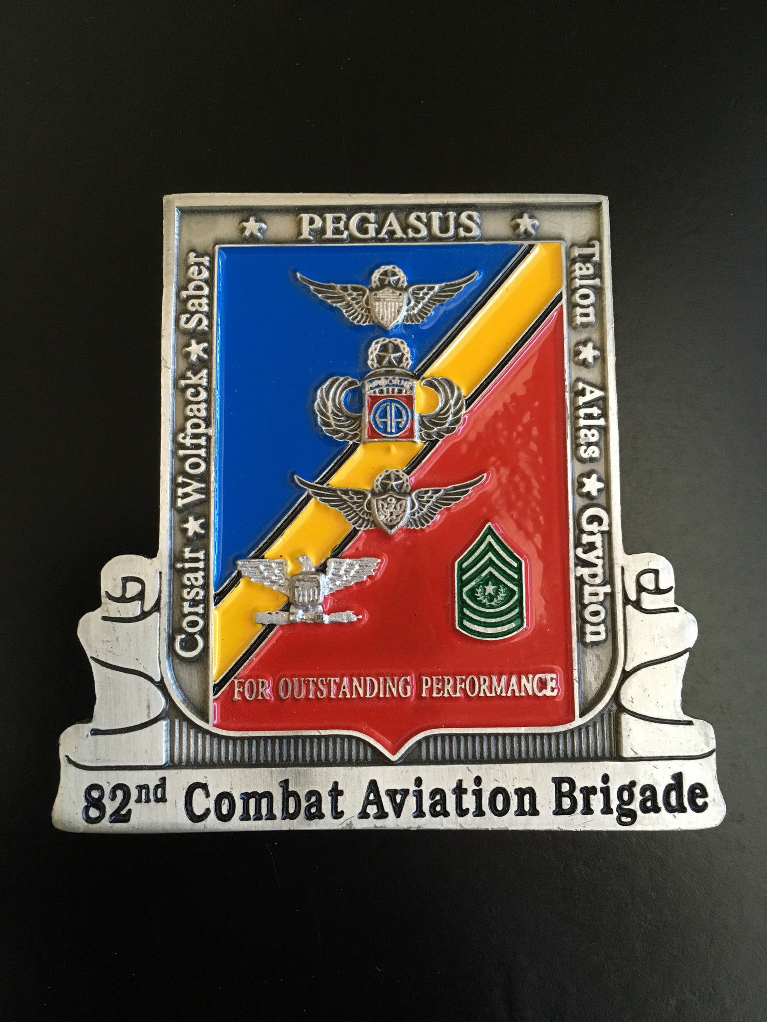 This coin was awarded by the Commander and CSM, 82nd Combat Aviation Brigade (82nd CAB), 'Wings of the Airborne', 82nd Airborne Division, Fort Brag, NC.