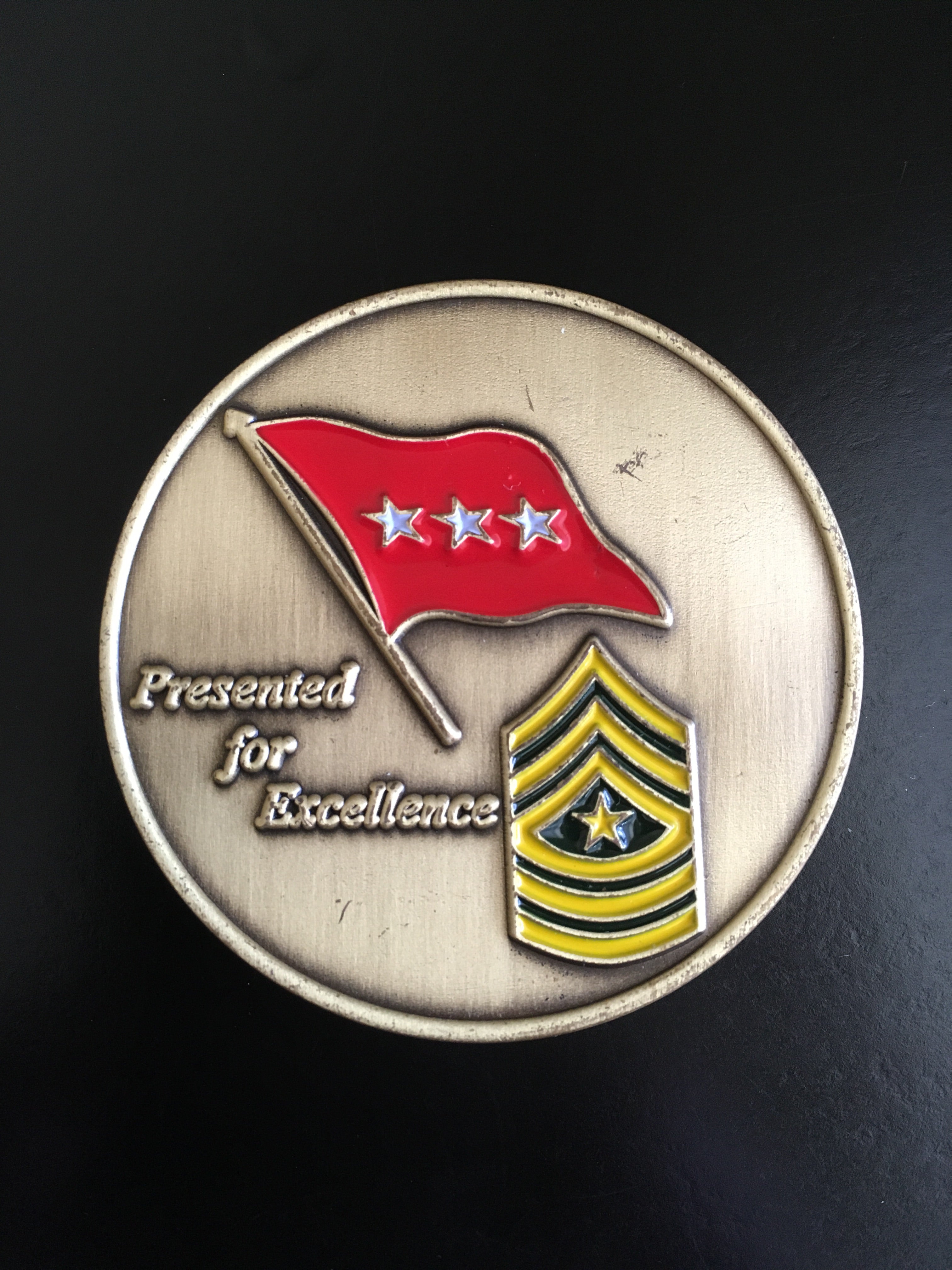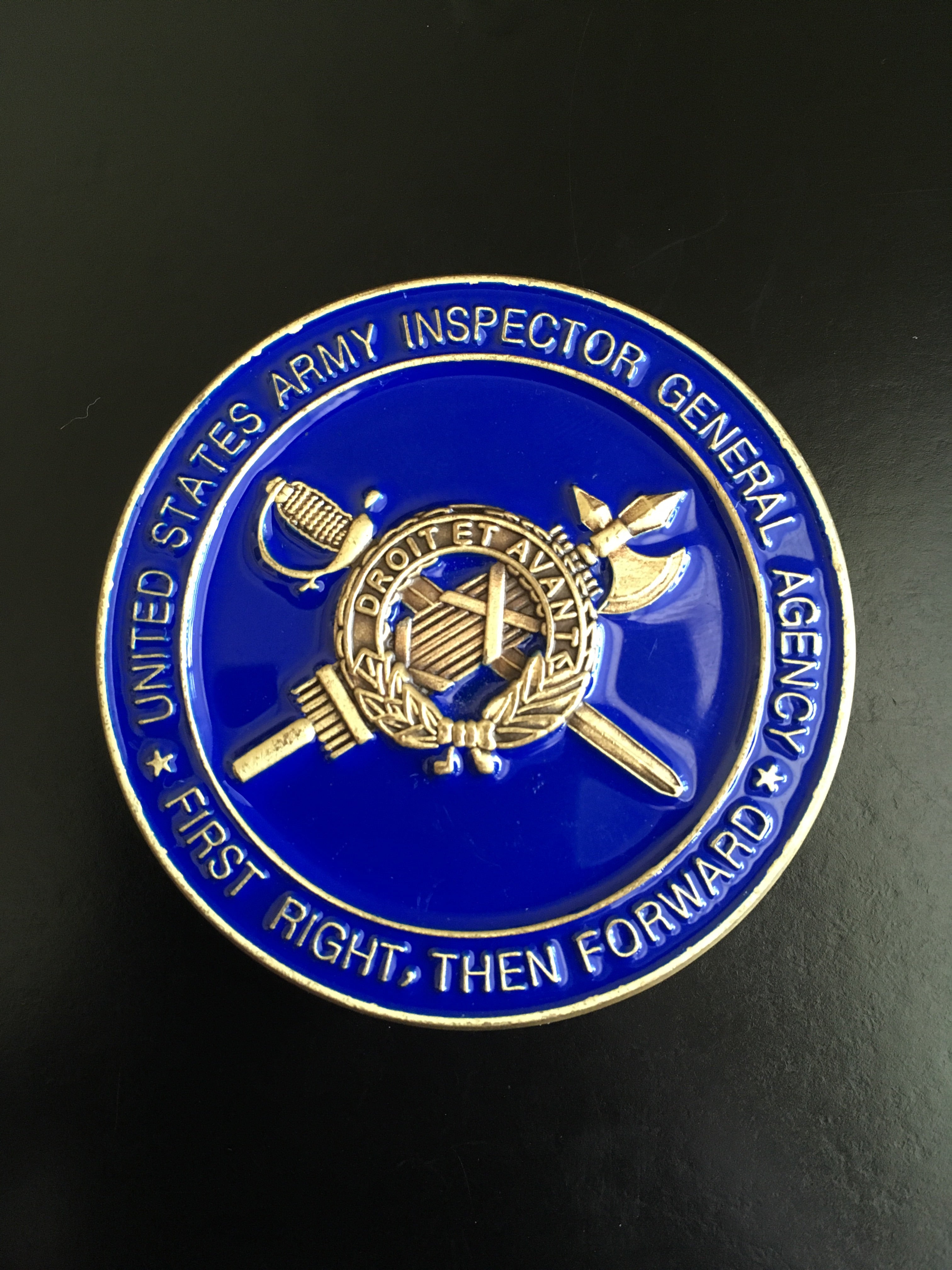 This coin was 'Presented for Excellence' by Lieutenant General David E. Quantock, the Army's 65th Inspector General (IG), between December 2014 and February 2018.