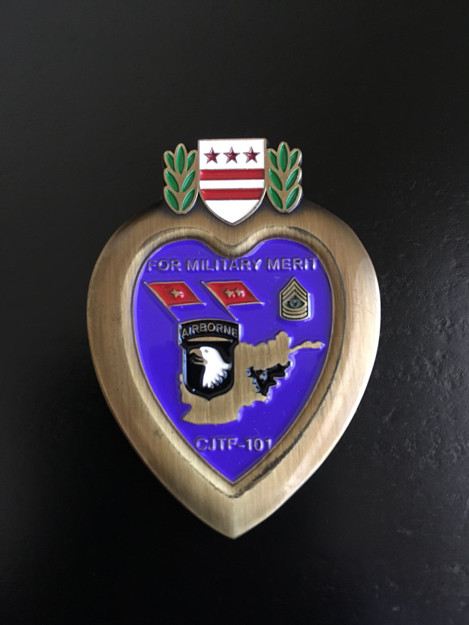 This coin was awarded 'For Military Merit' by the Commander and Commander Sergeant Major (CSM), Combined Joint Task Force 101 (CJTF-101) specifically to Soldiers wounded in combat during Operation ENDURING FREEDOM, Afghanistan.