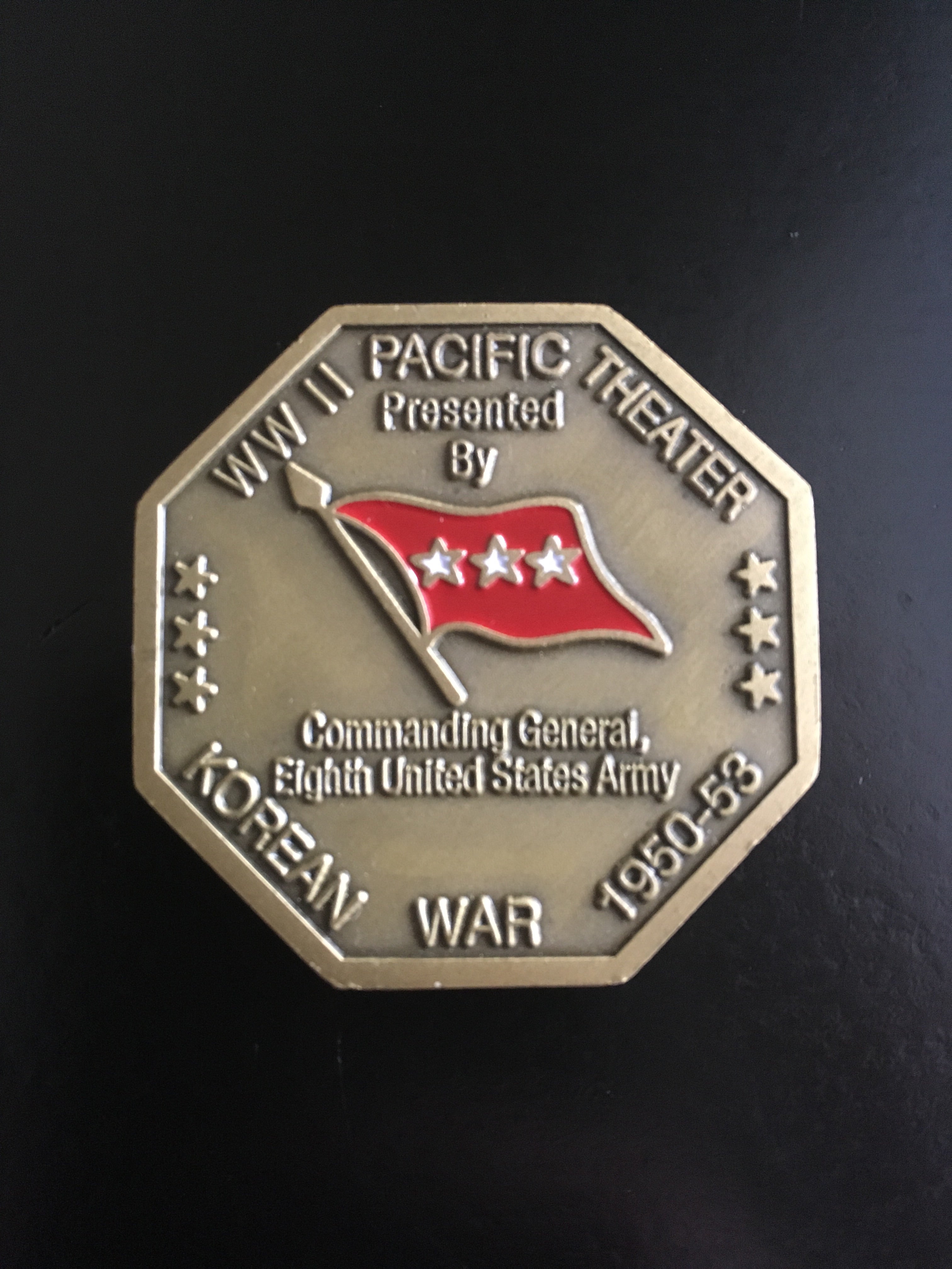 This coin was presented by the Commanding General, Eighth US Army (EUSA).