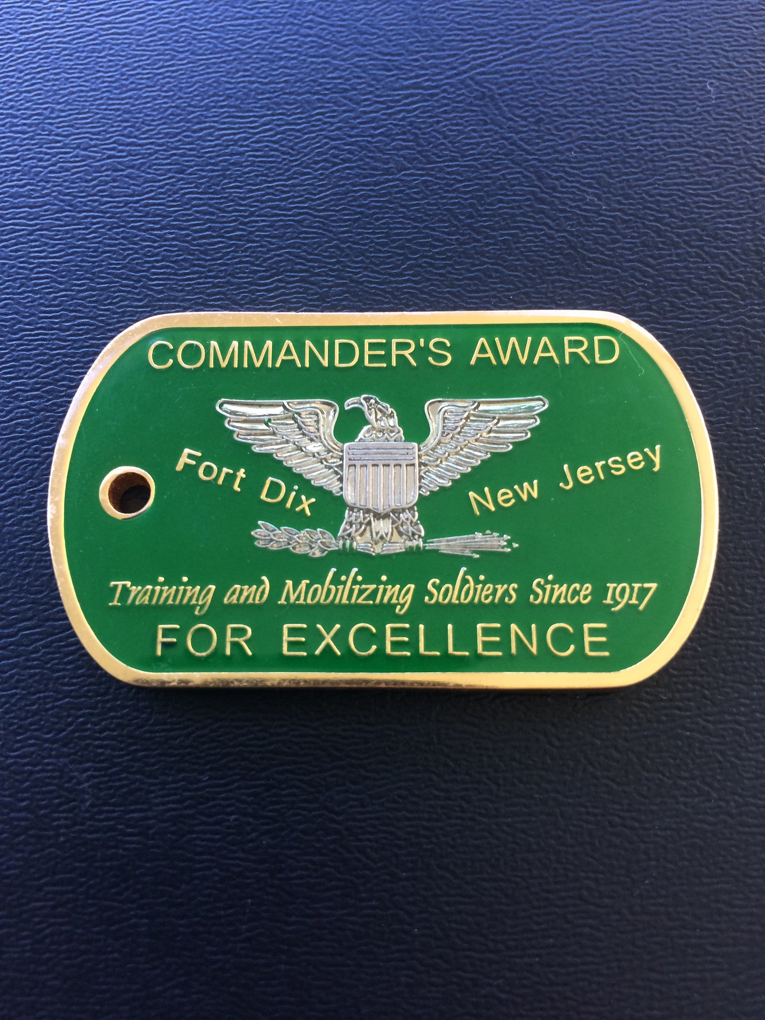 This coin was awarded for excellence by the Garrison Commander, Fort Dix, New Jersey.