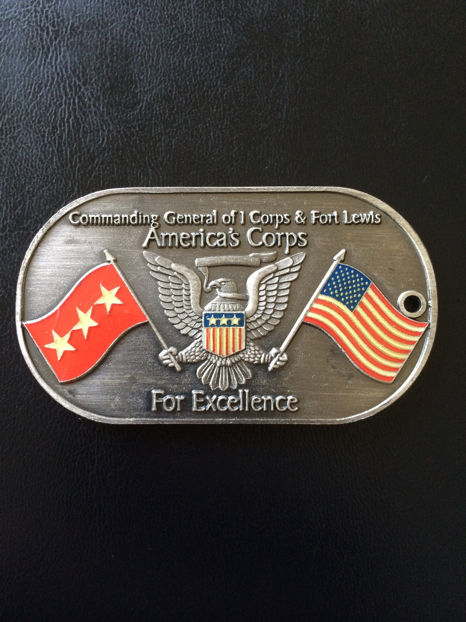 This coin was presented "For Excellence" by the Commanding General (CG), I Corps & Fort Lewis, Washington. "America's Corps"