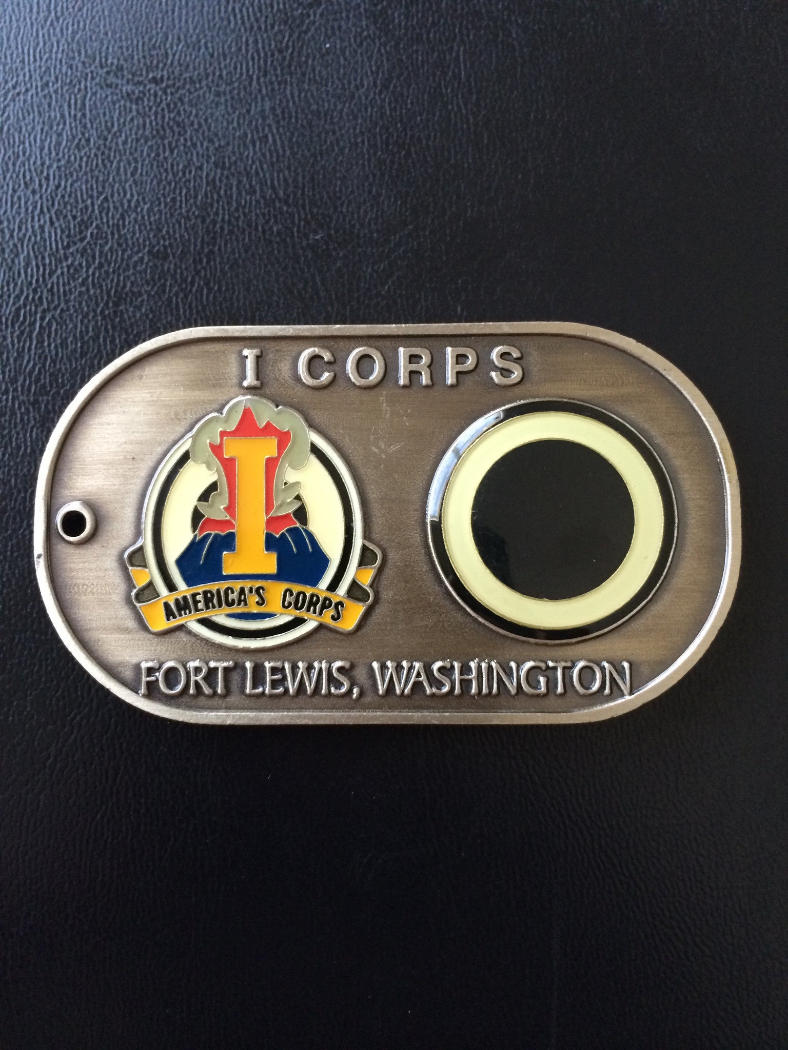 This coin was 'Presented for Excellence' by the I Corps and Fort Lewis Commanding General (CG).