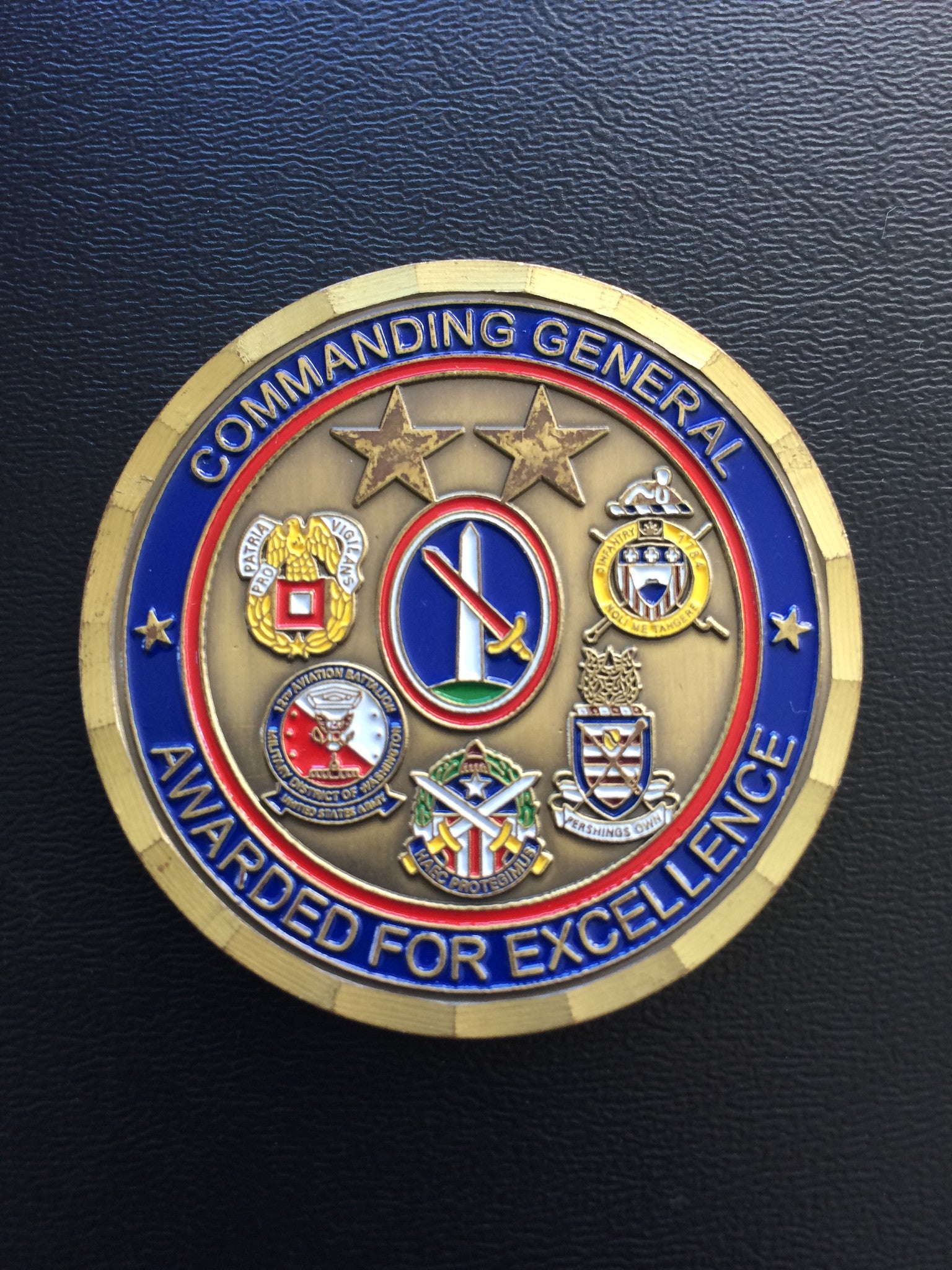 This coin was awarded by the Commanding General, Military District of Washington (MDW)