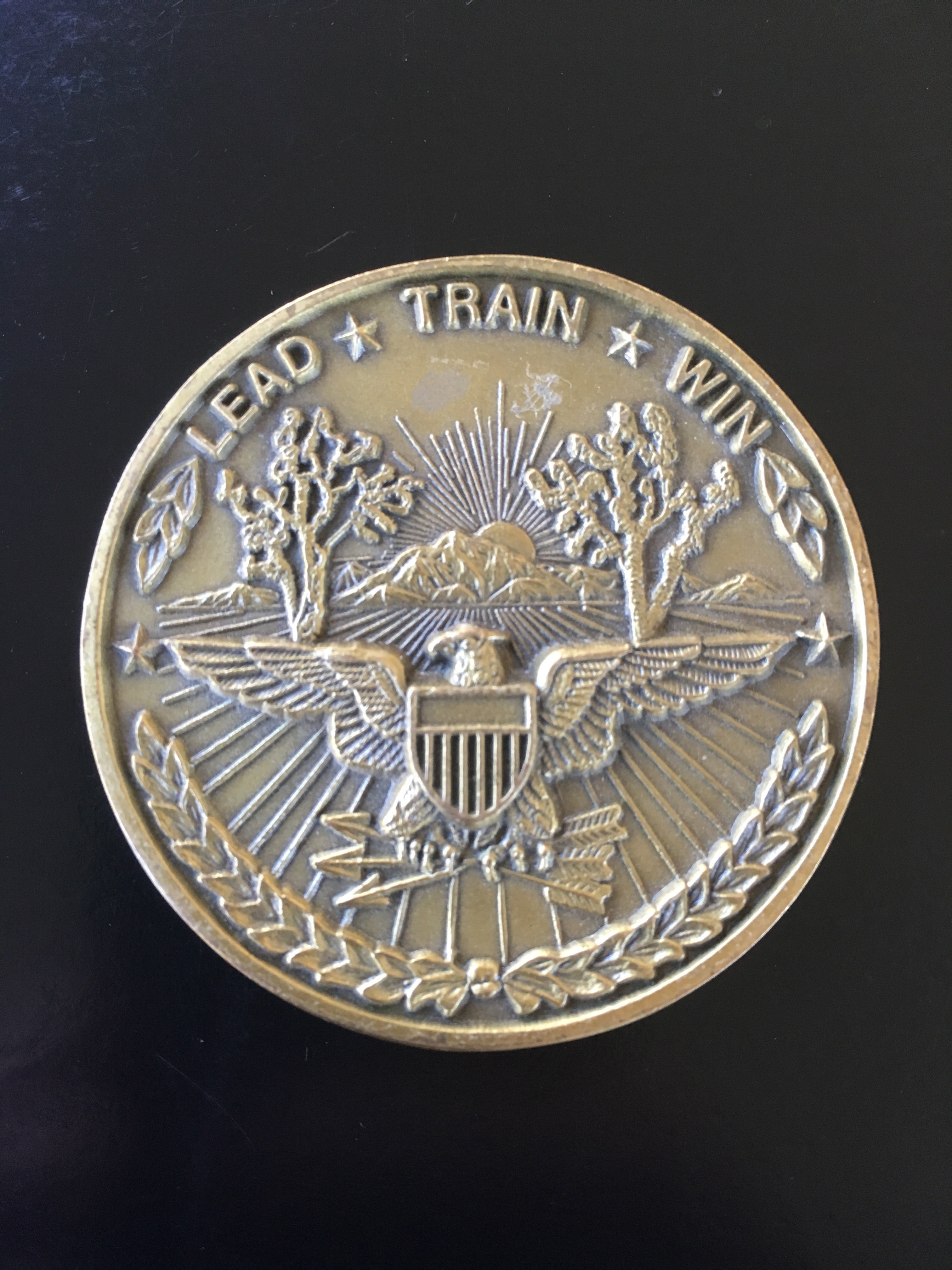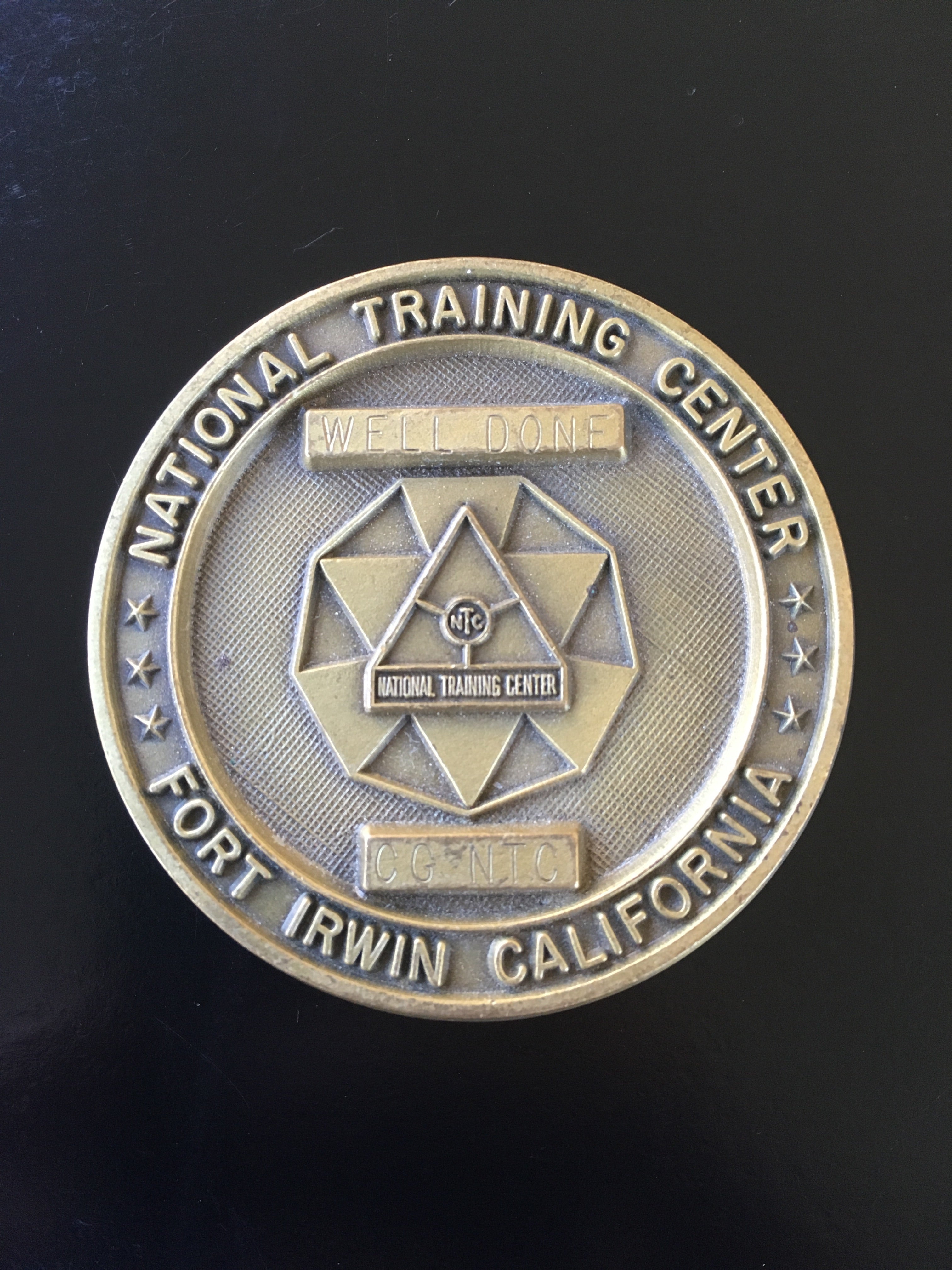 This "WELL DONE CG NTC" inscribed version coin was awarded by the Commanding General (CG), National Training Center (NTC) and Fort Irwin.