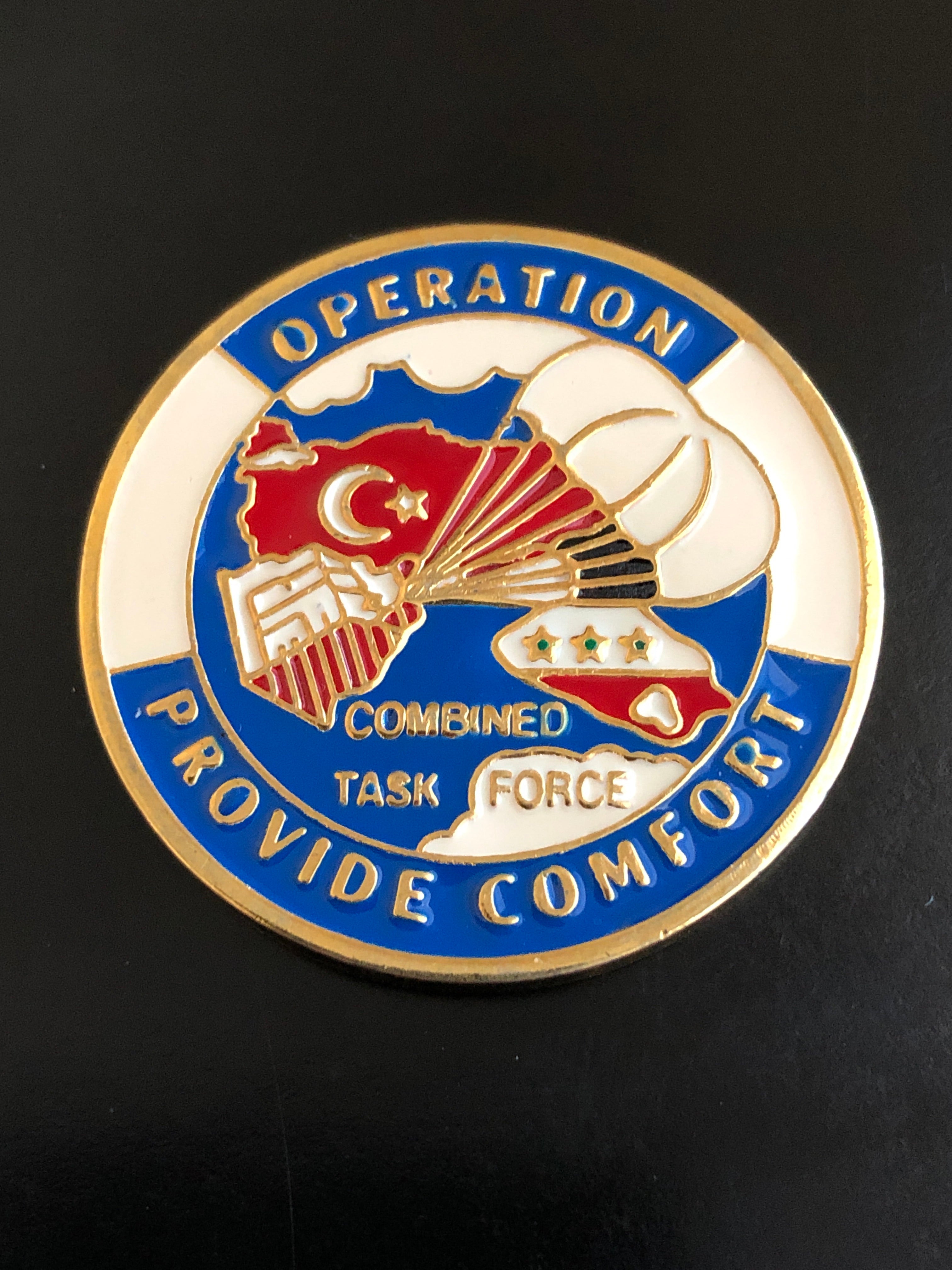 This coin was awarded by the Operation Provide Comfort (OPC) Commanding General, Lieutenant General John Shalikashvili between April 1991 and July 24, 1991 when OPC ended (OPC II began).