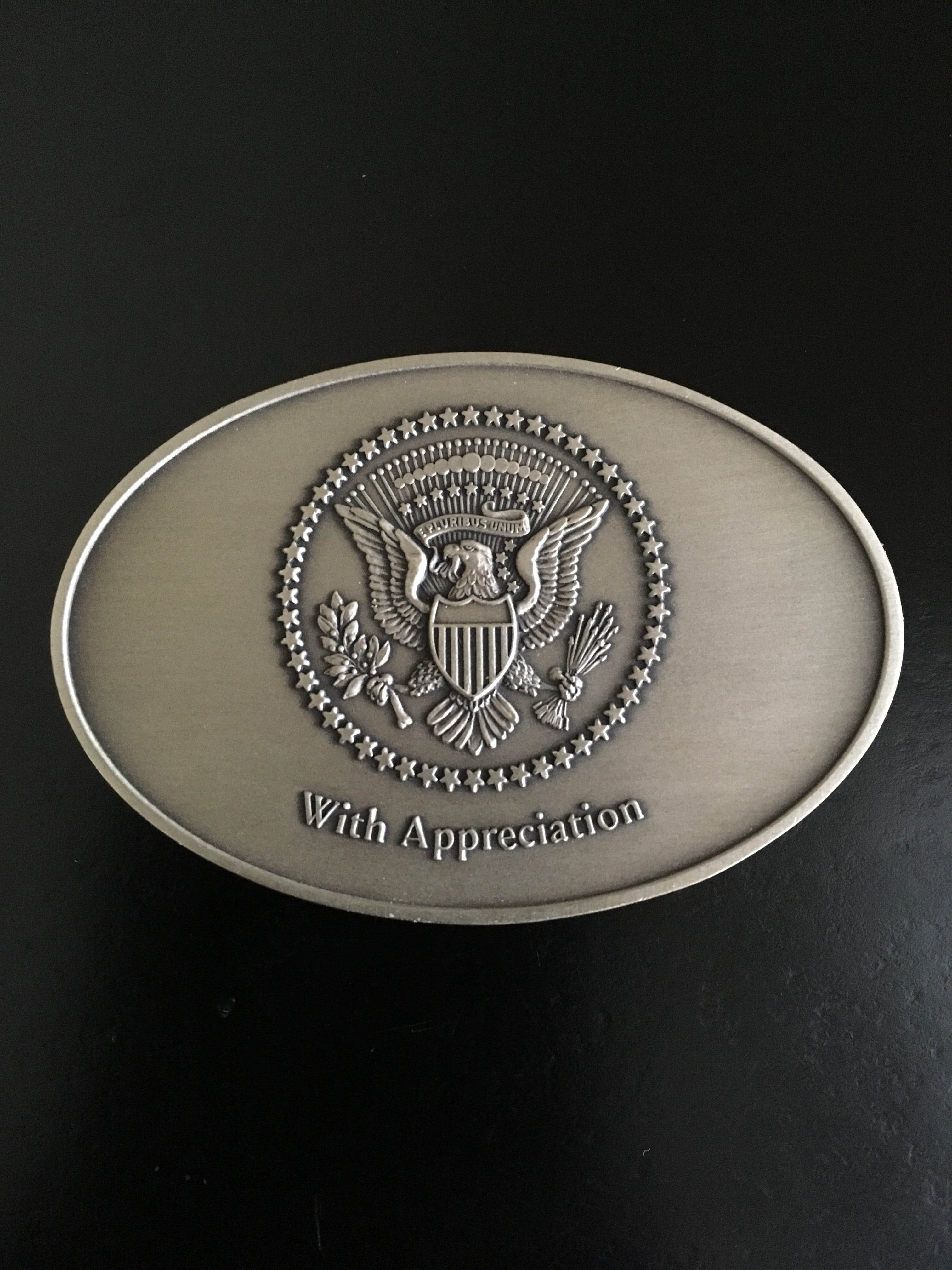 Note: President Bill Clinton displayed several racks of challenge coins, which had been given to him by U.S. servicemembers, on the credenza behind his Oval Office desk. These coins are currently on display at the Clinton Library. The challenge coins appear in the background of his official portrait, now hanging in the White House.