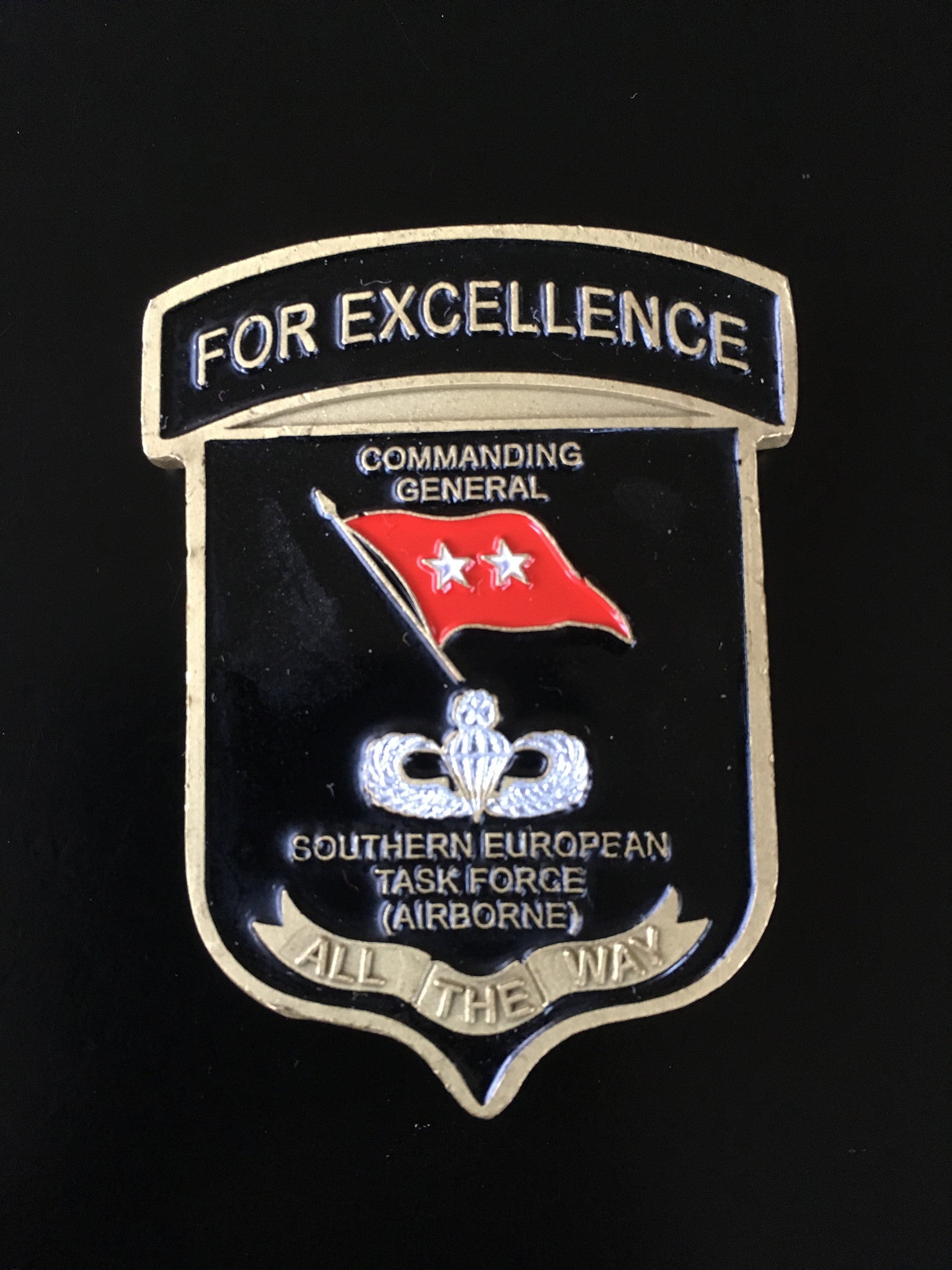 This coin was awarded for excellence by the Commanding General, United States Army Southern European Task Force (SETAF) (Airborne), Vicenza, Italy.
