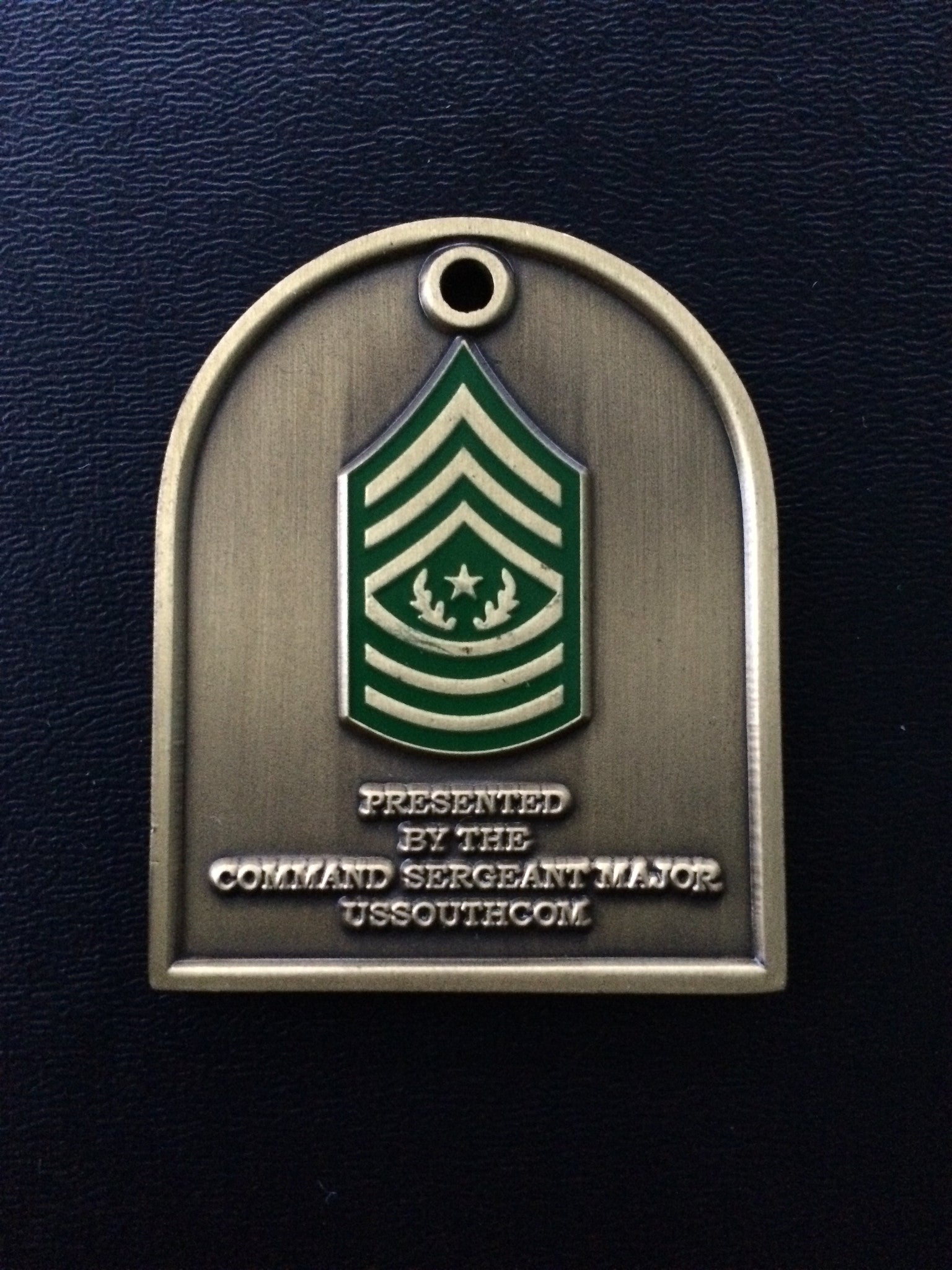 This coin was presented by the Senior Enlisted Leader (SEL), Command Sergeant Major (CSM), United States Southern Command (SOUTHCOM).