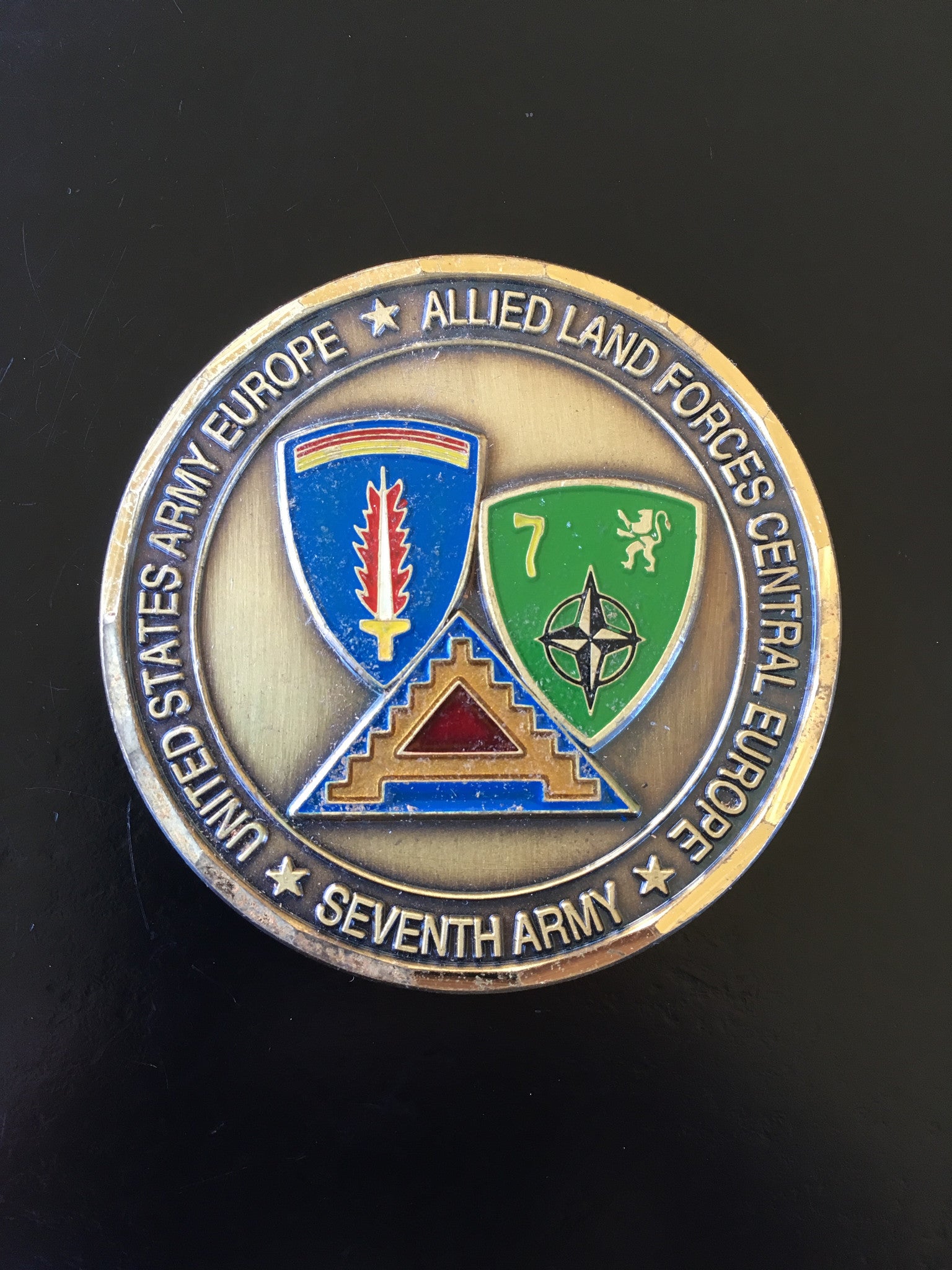 This coin was awarded by General William W. Crouch, 29th Commander in Chief (CINC), United States Army Europe (USAREUR) (CINCUSAREUR) / Commander, Allied Land Forces Central Europe (COMLANDCENT) & Seventh Army. General Crouch served as CINCUSAREUR from December 18, 1994 through August 5, 1997.
